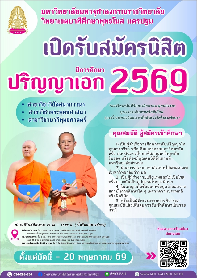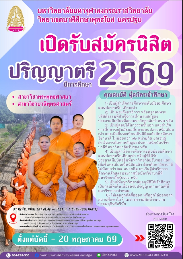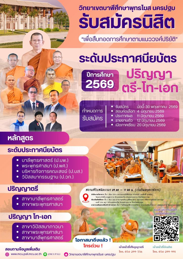 วันศุกร์ที่ ๖ และวันเสาร์ที่ ๗ กุมภาพันธ์ ๒๕๖๙ มจร วิทยาเขตบาฬีศึกษาพุทธโฆส นครปฐมจัดประชุมเชิงปฏิบัติการเพื่อการจัดทำ/ปรับปรุงข้อมูลการพัฒนาองค์กรด้วยเกณฑ์คุณภาพการศึกษาเพื่อการดำเนินการเป็นเลิศ...