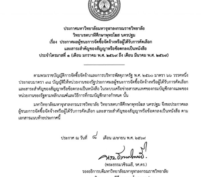 และสาระสำคัญของสัญญาหรือข้อตกลงเป็นหนังสือ ในระบบเครือข่ายสารสนเทศของกรมบัญชีกลางและของหน่วยงานของรัฐตามหลักเกณฑ์และวิธีการที่กรมบัญชีกลางกำหนด นั้น มหาวิทยาลัยมหาจุฬาลงกรณราชวิทยาลัย วิทยาเขตบานีศึกษาพุทธโฆส นครปฐม จึงขอประกาศผลผู้ชนะการจัดซื้อจัดจ้างหรือผู้ได้รับการคัดเลือก และสาระสำคัญของสัญญาหรือข้อตกลงเป็นหนังสือตาม เอกสารแนบท้ายประกาศนี้